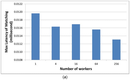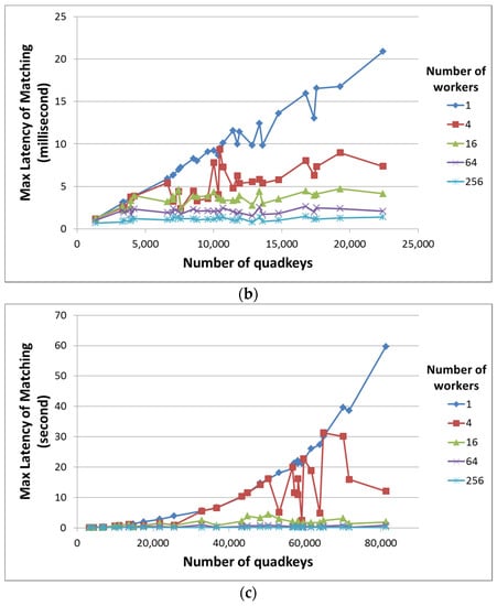 In addition, like the previous evaluation, we also measured the matching latency when applying different numbers of workers. In this evaluation, we used the same machine to simulate each worker handling different quadkeys in the distributed AHS model. Scenarios of distributed AHS models were simulated with one, four, 16, 64, and 256 workers. The maximum (instead of average) matching latency from workers in each scenario was also presented.