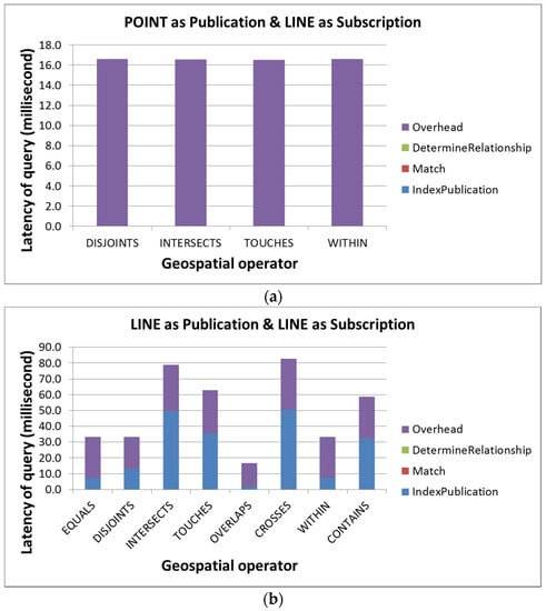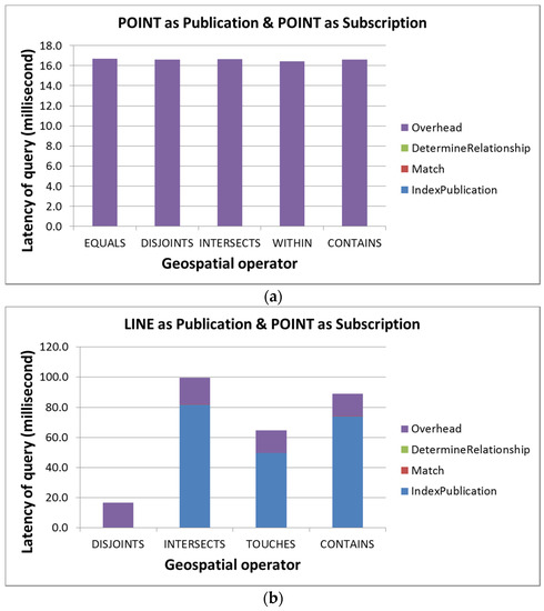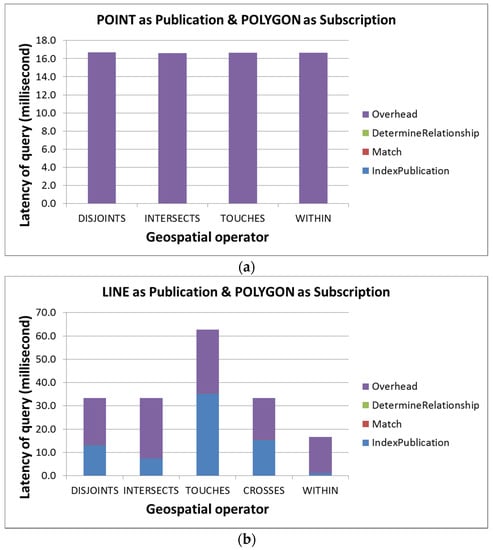 In this section, we evaluate the end-to-end query performance of the AHS model. We measure the latency of indexing publication, matching AHSPUB and AHSSUB and determining relationships as well as overheads. In addition, this evaluation is performed on all possible relationships. We simulated one subscription/publication pair for each possible relationship and tried to create geometries with common sizes for city-level applications. For example, we created the point, line, and polygon of subscription based on the ideas of a point in a city (e.g., a city landmark), a road crossing a city (e.g., a major highway), and the city coverage, respectively. Publications that match subscriptions for each possible topological relationship were also manually created (e.g., a sensor located at a road intersection).
