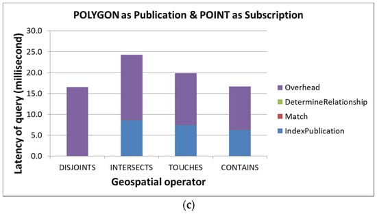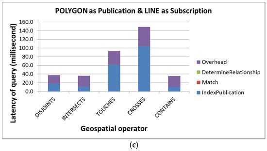 The end-to-end query performance for point as subscription and (a) point; (b) line; and (c) polygon geometry as publication.