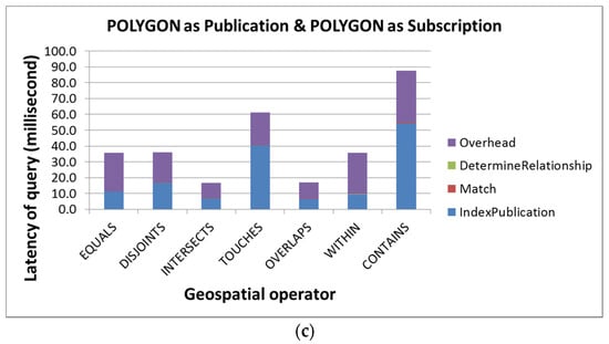 The end-to-end query performance for polygon as subscription and (a) point; (b) line; and (c) polygon geometry as publication.