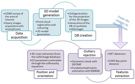 The project is still in progress and at now has seen the validation of the first results obtained in two test sites: the Bangbae metro station in Seoul and the ETRI research building in Daejeon. The basis of the IRBL procedure is the match between each real-time acquired smartphone images and a corresponding synthetically generated 3D image extracted by a database (DB), all implemented in an automated procedure. In the next sections, the entire workflow will be described. The developed algorithms will be analysed, and a complete description of the activities realised in the test sites with the validation will be reported. Figure 1 describes the procedure by the sequential steps: the 3D data acquisition with a LiDAR instrument, the 3D model generation, the database of RGB-D image realisation, the image retrieval with MPEG7 Compact Descriptor for Visual Search (CDVS) and the IRBL algorithm applications for positioning. In the next sections, the attention will be focused on data acquisition and generation of the RGB-D image DB as a fundamental part for the correct application of the procedure.