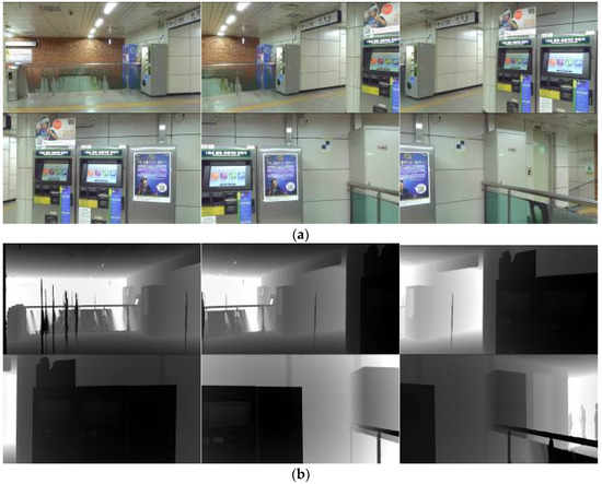 Figure 5 shows an example of a set of RGB-D images connected to a scan position in Bangbae metro station (X = 322,920.858, Y = 4,150,175.414, Z = 45.967 in metres—UTM-WGS84, 52S).