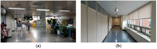 (a) An indoor Bangbae station view; and (b) a typical aisle in the ETRI building.