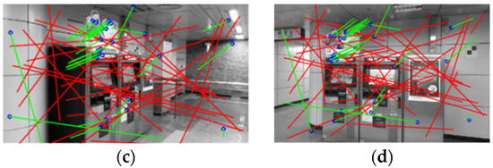 An example of quite good solution for Bangbae station, image No. 8: (a) query image; (b) reference image from DB; (c) query image; and (d) reference image with used feature points; the matched points that have been rejected are in red.