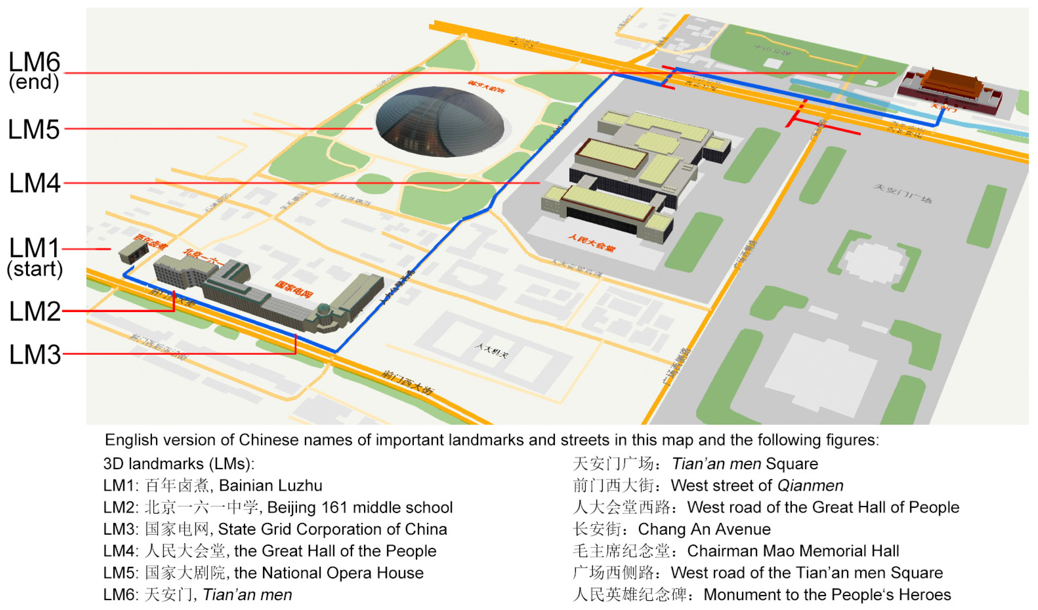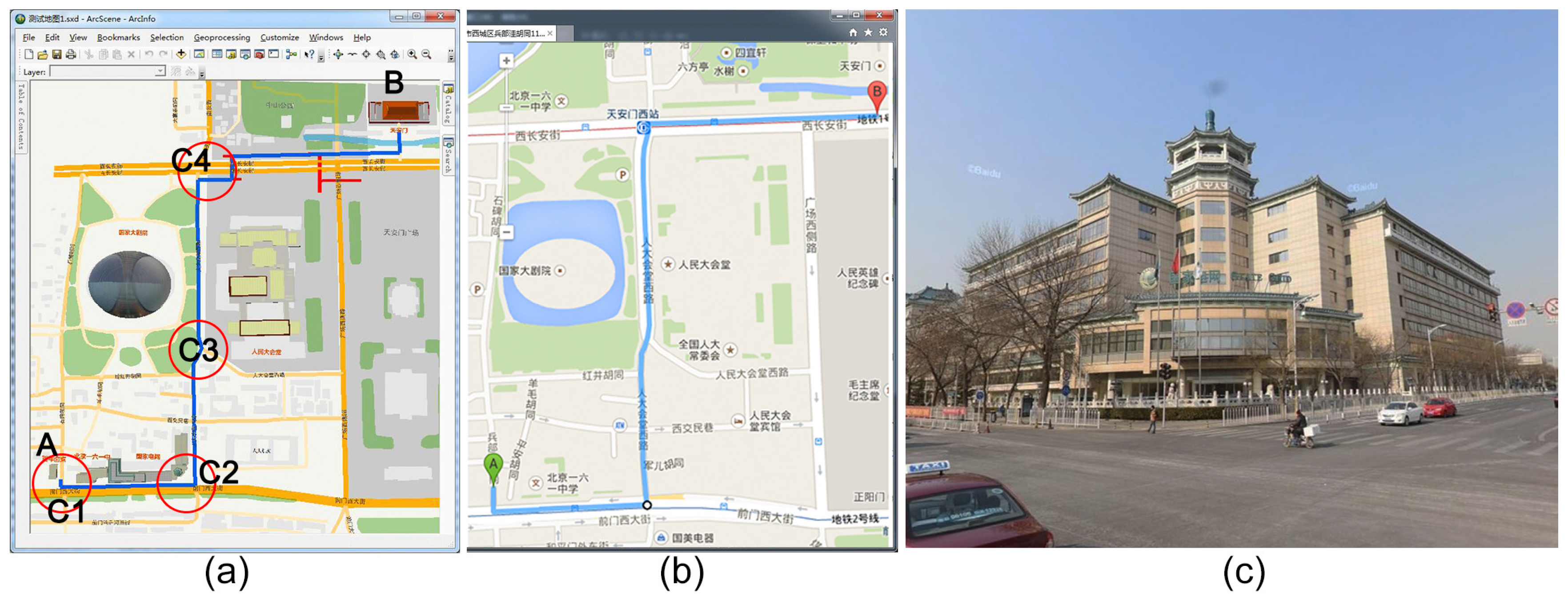 As shown in Figure 3, we used the 2D Google map as the 2D map. The 3D view was displayed in ESRI ArcScene and both the 2D and 3D maps were interactive. A route from the start to the destination about 1.7 km long was highlighted on the map. It began from starting point A, Bainian Luzhu (a snack bar, LM1 in Figure 1) and ended at destination B, Tian’an men (a famous tourist attraction in Beijing, LM6 in Figure 1) (Figure 3a). We selected four crossroads (labeled C1 to C4) along the route corresponding to the four orientation tasks in the experiment. In each task, the participants were presented with a street view scene, which was located at one of the four decision points. The participants were required to determine the direction to the next stop by searching cues from the street view and recalling previously acquired information from the 3D or 2D map.