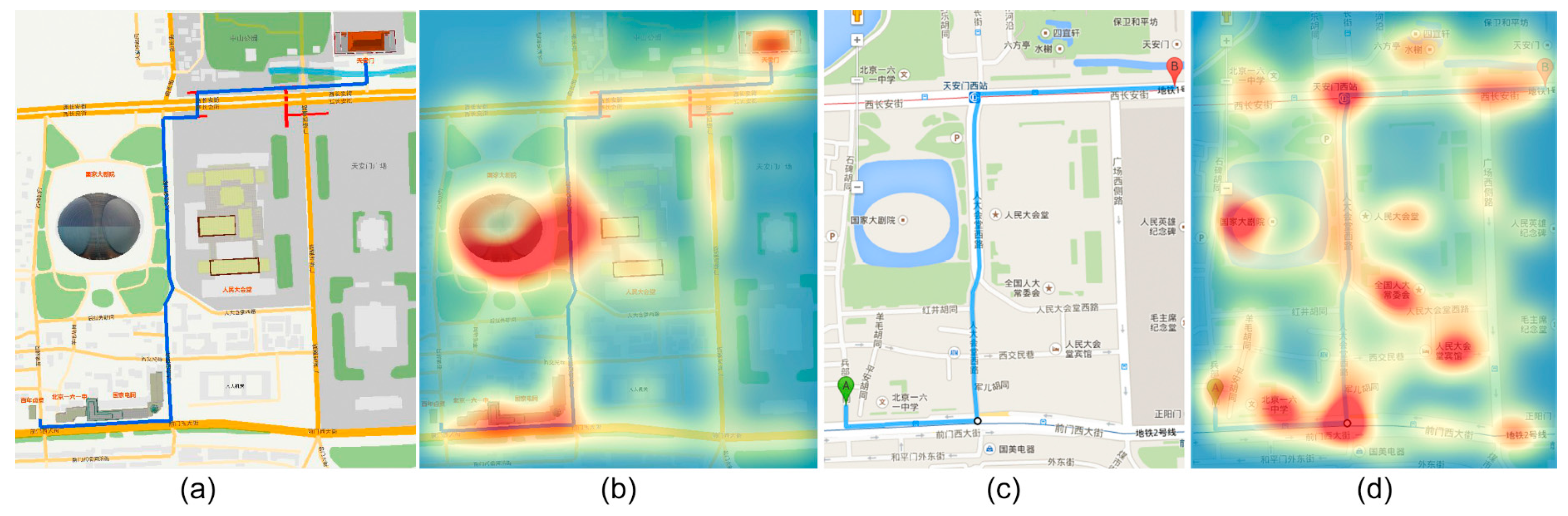 The results of pre-evaluation: (a) the designed 3D map; (b) saliency map of the 3D map; (c) the 2D Google map; and (d) saliency map of the 2D map. Darker red means higher saliency, and light green indicates lower saliency. Refer to Figure 1 for English version of Chinese names of landmarks and streets in the map. The blue line indicates the pre-defined route.