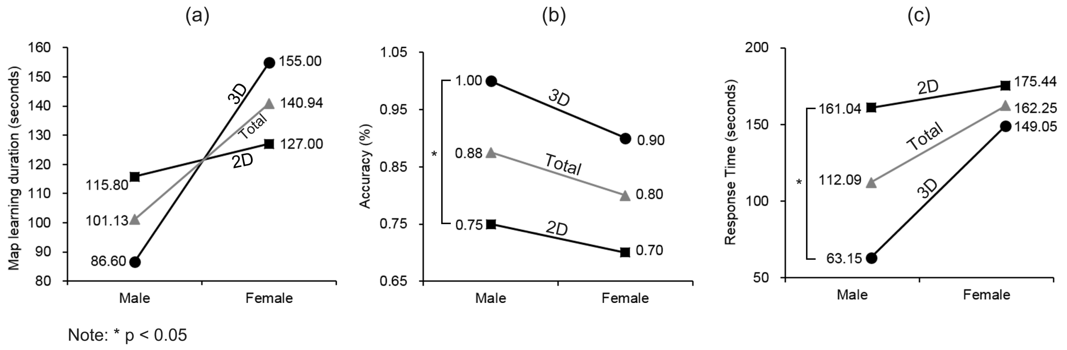 Although this experiment was a two-factorial design (2D/3D and male/female), the designed 3D map cannot be said to be comparable to the 2D map, for the two representations were not informationally or computationally equivalent [49]. The 3D map allowed the users to change viewing angles, for instance. Therefore, we abandoned direct comparisons between 2D and 3D. In future study, it would be desirable to design maps that are comparable in order to test the effect of dimensionality.