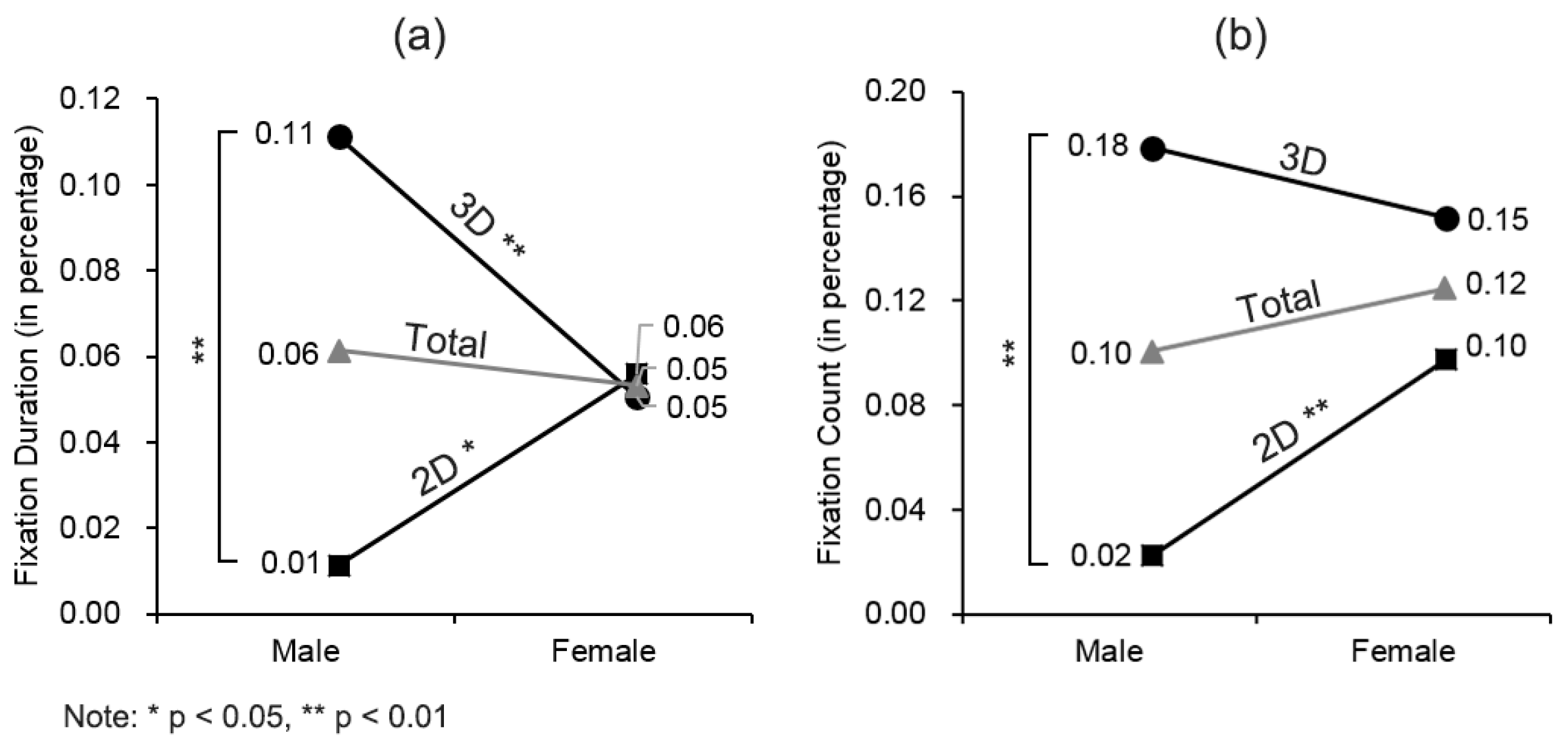 In terms of comparisons across map types, males fixated on landmarks for significantly longer when using the 3D map than when using the 2D map (U = 0.00, Z = −2.611, p = 0.008 < 0.01), whereas females had no significant difference in fixation duration between the 2D and 3D maps (U = 11.00, Z = −0.313, p = 0.841 > 0.05). The significance of the difference in fixation count is similar to that of the difference in fixation duration. In other words, the 3D map increased fixation duration and fixation count on landmarks for males but not for females. This is consistent with the observation that males performed better when using the 3D map than when using the 2D map, whereas females did not.