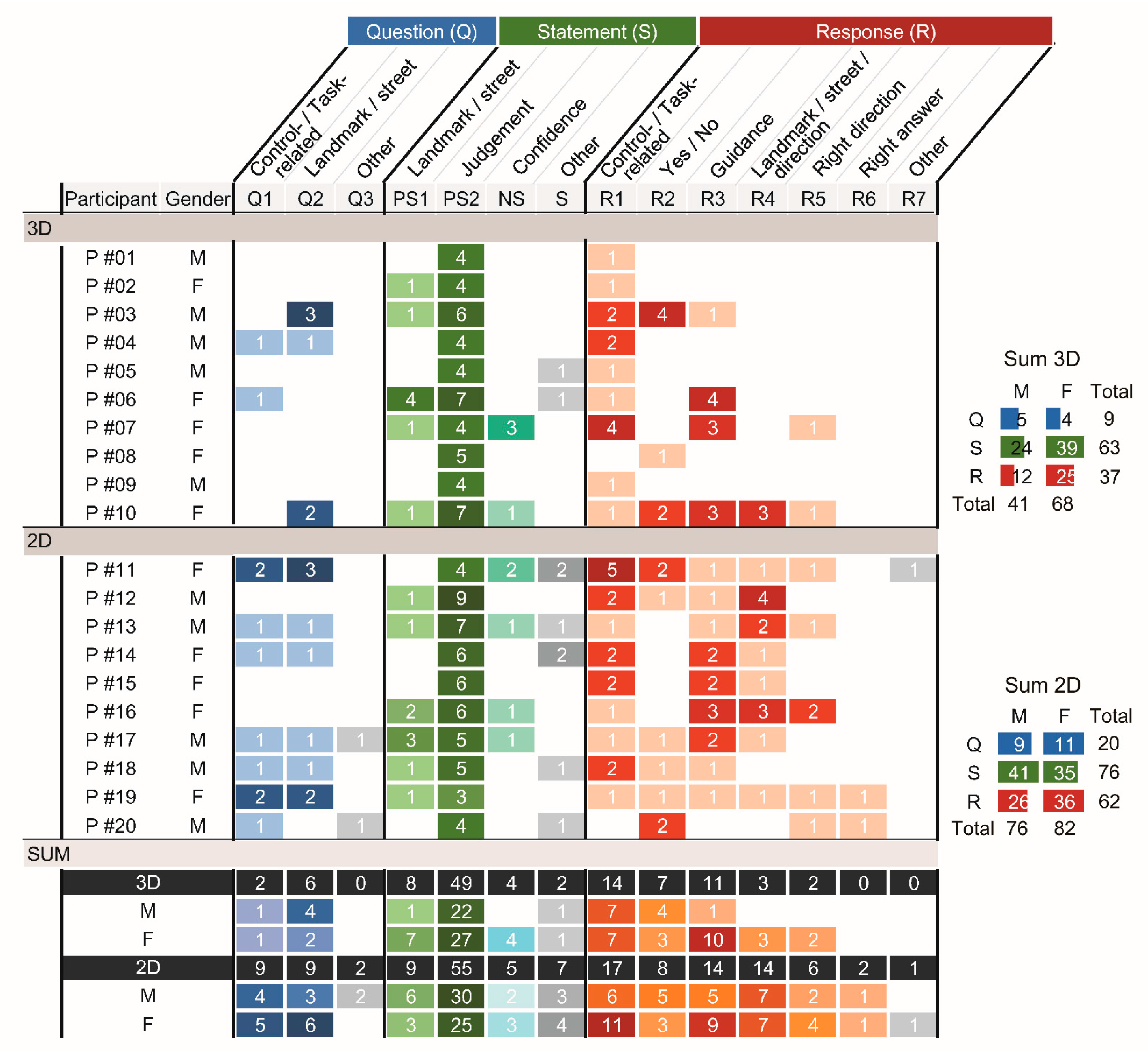 Generally, females had slightly more questions (Q = 15) and statements (S = 74) than males (Q = 14, S = 65) and correspondingly, the experimenter responded more to females (R = 61) than males (R = 38). Males had fewer questions and negative statements (Q2 + NS = 9) than females (Q2 + NS = 15). Females also received a higher level of responses more frequently (R4 + R5 + R6 = 17) than males (R4 + R5 + R6 = 10) regardless of the map type. These results indicate that males appeared to be more confident about their situation and judgments than females. Both males and females had fewer questions, statements, and responses when using the 3D map than when using the 2D map.