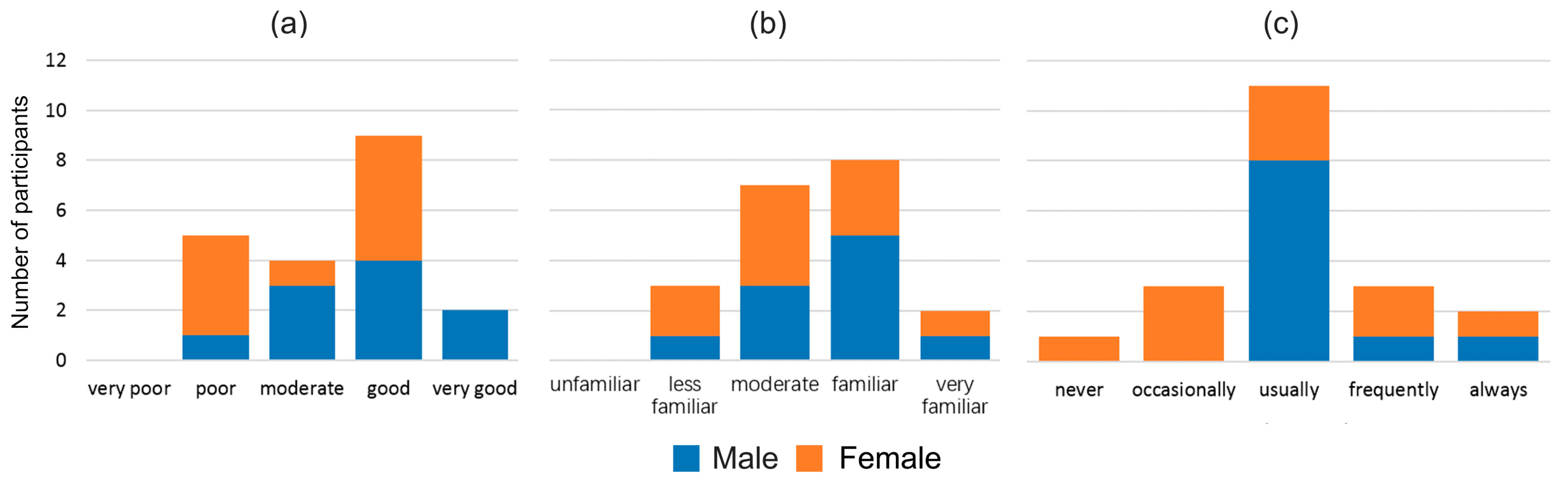 Self-rating results of: (a) the ability to find a way to a destination in an unfamiliar environment; (b) the familiarity with electronic maps; and (c) the experiences using mobile maps for wayfinding.