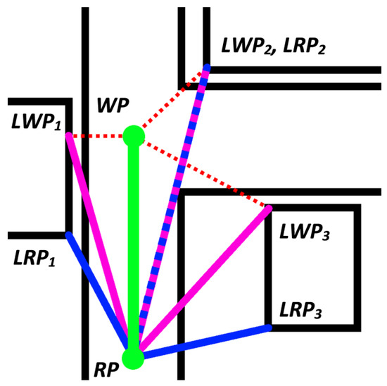 Position in relation to the decision point: Calculation of the location of the feature with regards to the decision point is a more complicated value to derive as it requires a number of comparisons. The end result is an indication that the feature is before, after or alongside the waypoint. The metric of location in relation to the turning point is derived by identifying differences between the distances of WP to RP, RP to LRP and RP to LWP. In the case that RP → LRP and RP → LWP are less that RP → WP, it can be assumed that the landmark candidate is before the turning point. If RP → LRP is greater than RP → WP, then the landmark can be assumed to be after the turning point. When RP → LRP is less than RP → WP and RP → LWP is greater than RP → WP, then it can be assumed that the landmark candidate is found alongside the WP. Looking at Figure 2, it can be seen that the distance between RP → LRP1 is less than RP → WP, but RP → LWP1 is larger than RP → WP; therefore, that feature is said to be alongside the turning point. RP → LRP2 and RP → LWP2 are both larger than RP → WP; therefore, that feature is seen as being after the turning point. Finally, both RP → LRP3 and RP → LWP3 are smaller than RP → WP, and so that feature is seen as being before the turning point. Figure 2 shows the information used for calculating the position of three features in relation to a turning point.