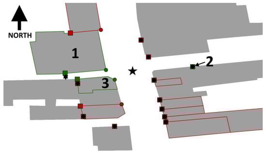 Figure 3. Location of features. Squares represent points on the feature closest to the reference point, and circles represent points on the feature that are closest to the waypoint. A square filled with a circle signifies the two points are at the same (or very close) locations (source data © OpenStreetMap contributors).