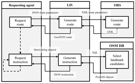 Figure 4. Request flow of the navigation service. LIS, Landmark Identification Service; ORS, OpenRouteService.