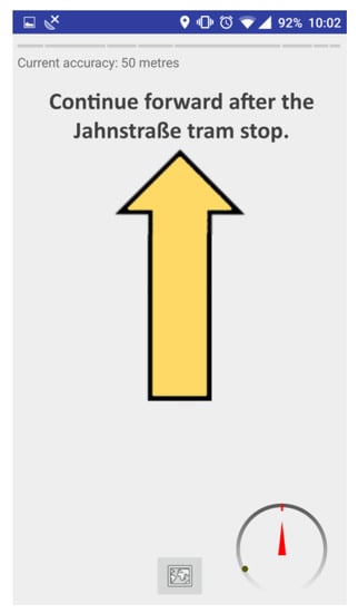 When a route is generated based on parameters set by the user (currently mobility-orientated restrictions, such as avoiding specified heights of drop curbs and specific surfaces), the user is presented with instructions for navigation. These instructions are generated by using the GPS location of the device and the unique id of the route being followed, then passing this information to the LIS. This process is performed constantly throughout the navigation task at predefined temporal spacings. As well as a visual display (see Figure 5) of the instruction, the user can also switch to a map view for a general overview of the route as a whole. The instructions are also vocalized via the text-to-speech functionality of the user’s mobile device. This vocalization is performed once when the instruction changes and once when the user approaches the way point. To aid in determining the direction that should be followed, a compass-like display is presented, which indicates the relative direction to the way point for which the instruction is.