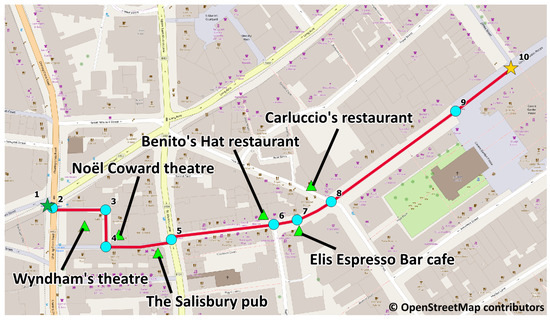 Figure 6. Route generated showing instruction points and landmarks used (base map © OpenStreetMap contributors).