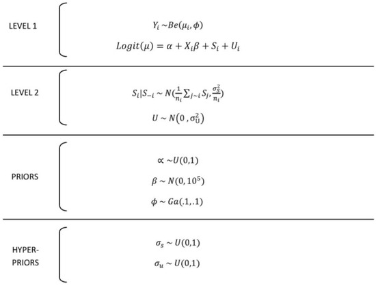 Generalized linear models may be analyzed following a frequentist methodology. However, Bayesian methods introduce random effects and are more flexible. Taking a Bayesian approach, the parameters are treated as random variables, and we need to incorporate prior distributions to assess prior knowledge [45]. In our study, we used vague Gaussian distributions for the fixed effects and an improper uniform distribution for . Finally, we used a Gamma distribution to define the prior distribution of . A sensitivity analysis on these prior distributions was performed to select the most suitable possible prior distributions, repeating the study with different prior distributions values. Specially, we focus on the prior distribution of the variability parameters (σs, σu, and ). The results did not change using different prior distributions. Figure 1 shows the complete model and the hierarchical structure.