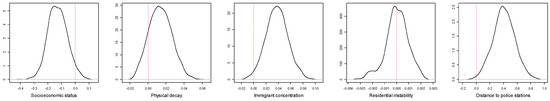 A Bayesian beta regression model was conducted with the five explanatory variables (socioeconomic status, immigrant concentration, residential instability, physical decay, and distance to the police station) and two random variables were introduced (unstructured U and structured spatial S effect). The DIC of this model was −1431.8. We ran a second model without these two random variables, and the model fit was clearly the worst (DIC = −190.7). The complete model represented the best fit and was therefore selected as the final model. Table 2 summarizes the results of the final regression model.