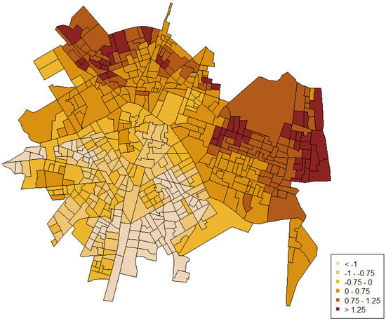 Beyond the effect of the variables, the results showed the influence of spatial dependency and unstructured heterogeneity. A Bayesian approach reveals the spatial effect through illustrative maps. Figure 3 shows the posterior mean value for the spatial component. There is a clear geographic pattern: northern areas of the city have higher mean values than southern areas. This indicates the existence of a significant underlying spatial process that is not explained by the variables we have explored.