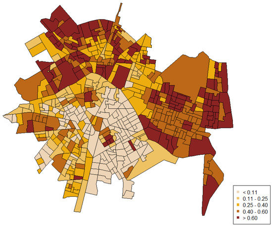 Socioeconomic Status (SES): We constructed an index using several socioeconomic indicators, as in previous research [10]. These indicators showed a high correlation, and a scale was created through factor analysis to avoid collinearity. The scale consisted of the following variables: (a) cadastral value, an administrative value of a property calculated by the city council and used as a reference for fiscal and other administrative purposes; (b) percentage of high-end cars; (c) percentage of financial businesses (percentage of financial institutions and insurance companies out of total activities); (d) percentage of commercial businesses (percentage of trade, hostelry, or repairs business out of total activities); and (e) education level, measured on a 4-point scale, where 1 = less than primary education, 2 = primary education, 3 = secondary education, and 4 = college education. We selected the first principal component of the factor analysis in which the five variables had a relevant factorial weight (i.e., each variable was properly represented in the scale).