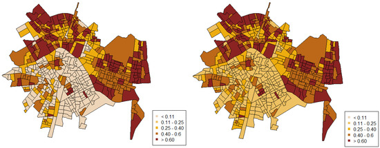 Figure 4 shows the mean level of drug-related police interventions in each census block group once we incorporated explanatory variables and random effects (heterogeneity and spatial autocorrelation). Some areas have high levels of interventions, and others have very low levels. Specifically, there is a higher probability of drug-related interventions in the northern and eastern zones; some areas have a level of intervention higher than 80%. This map shows the areas with higher mean levels of drug-related police interventions, which is useful when planning and implementing prevention and intervention strategies. Also, to map the uncertainty associated with the posterior means, Figure 5 represents the map of the first and the third quartile for the posterior mean level of drug-related police interventions.