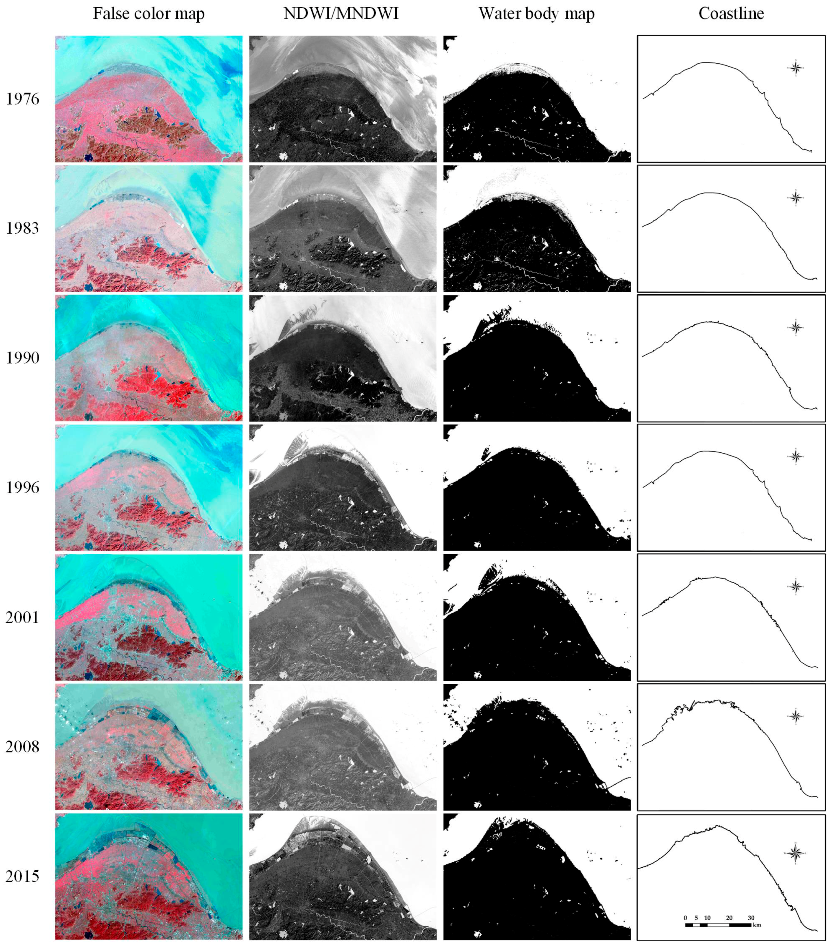 21]. The Landsat series images became evident since the public availability of the United States Geological Survey (USGS) in 2008. Up to date, many researchers have applied Landsat series images to extract the coastline changes of different study areas. For example, Kevin et al. applied Landsat TM imagery covering the Nile Delta coast in 1984, 1987 and 1991 to detect the position changes of the coastline [