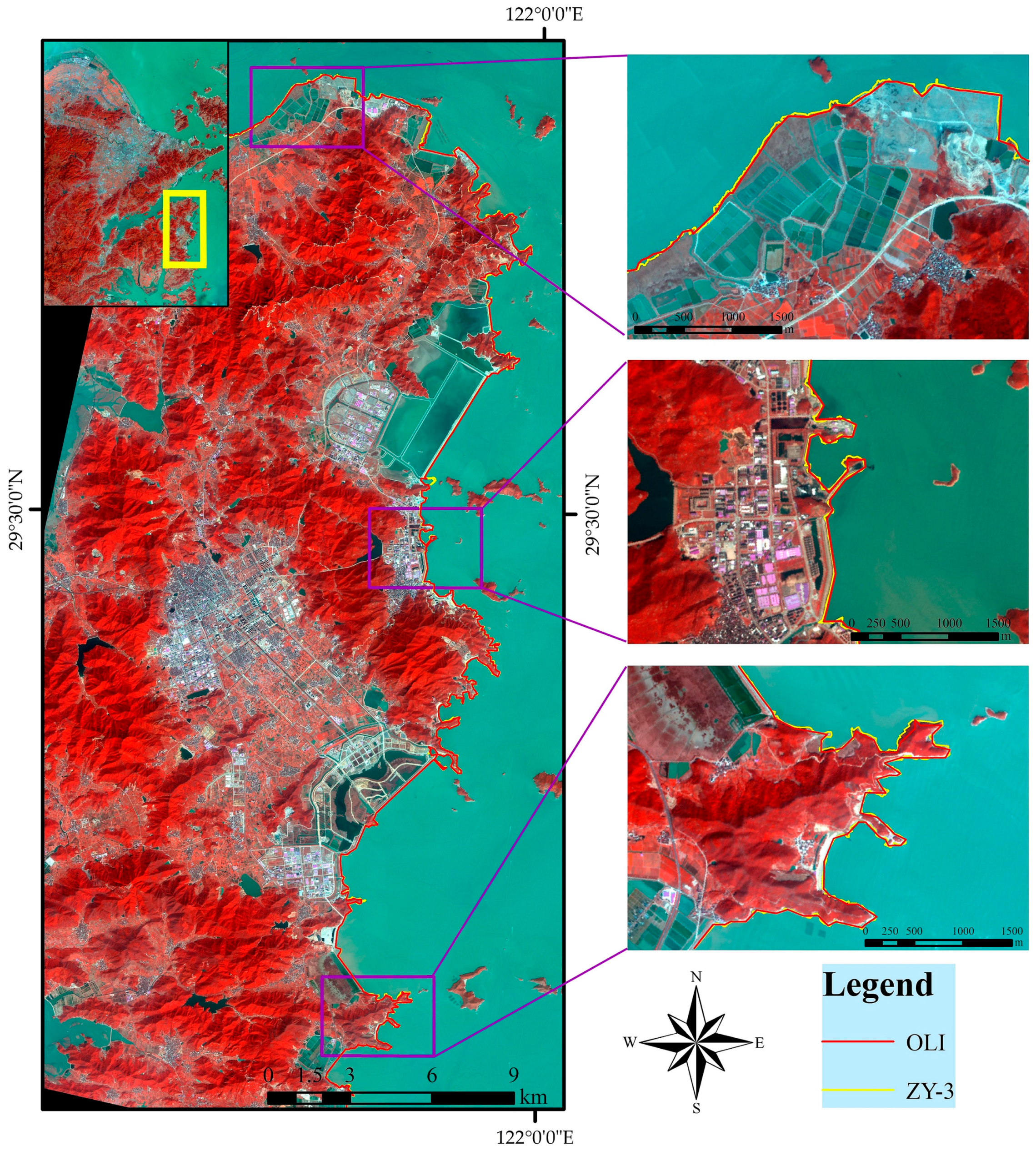54] was used to assess the accuracy of coastline extraction results. The ZiYuan-3 (ZY-3) multispectral image with a spatial resolution of 5.8 m [