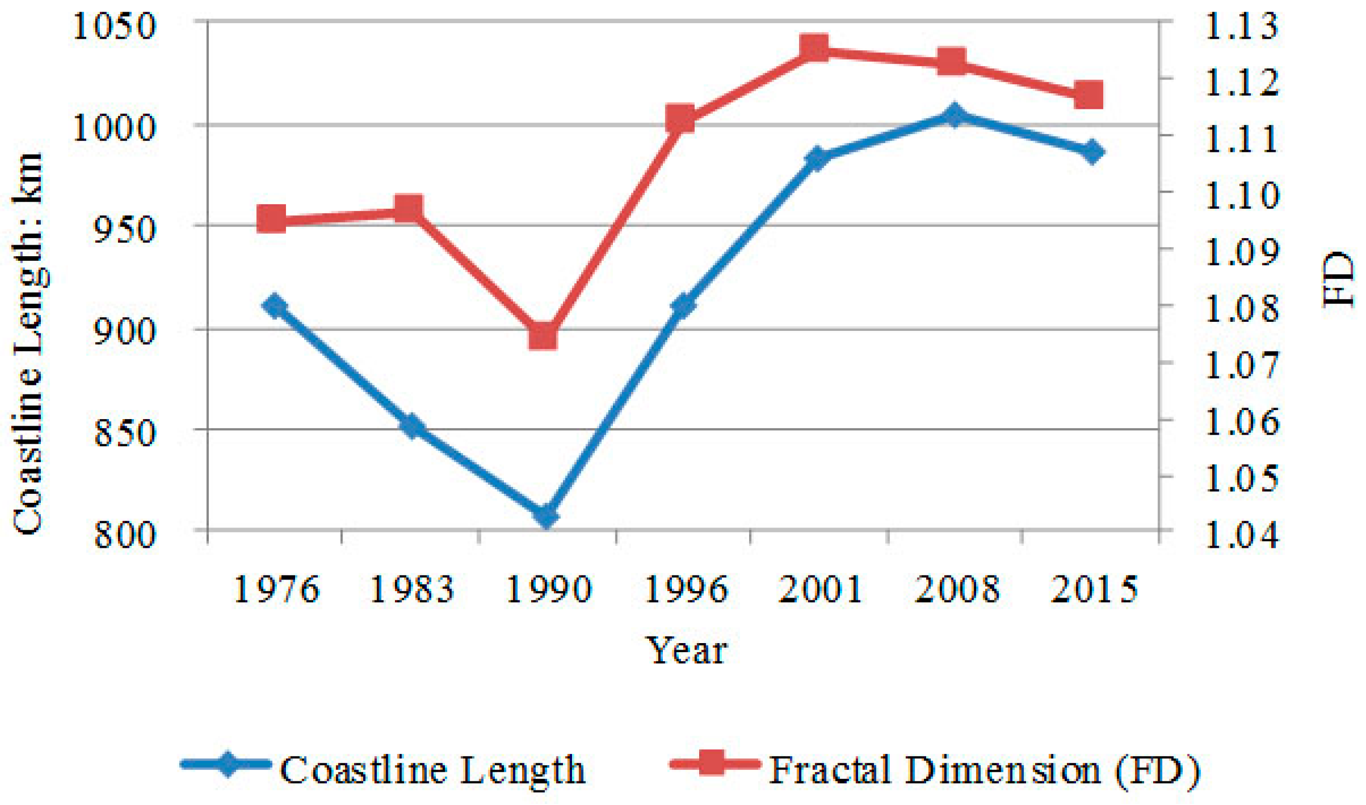 Figure 9a, and the change of the coastline length and the FD values are shown in