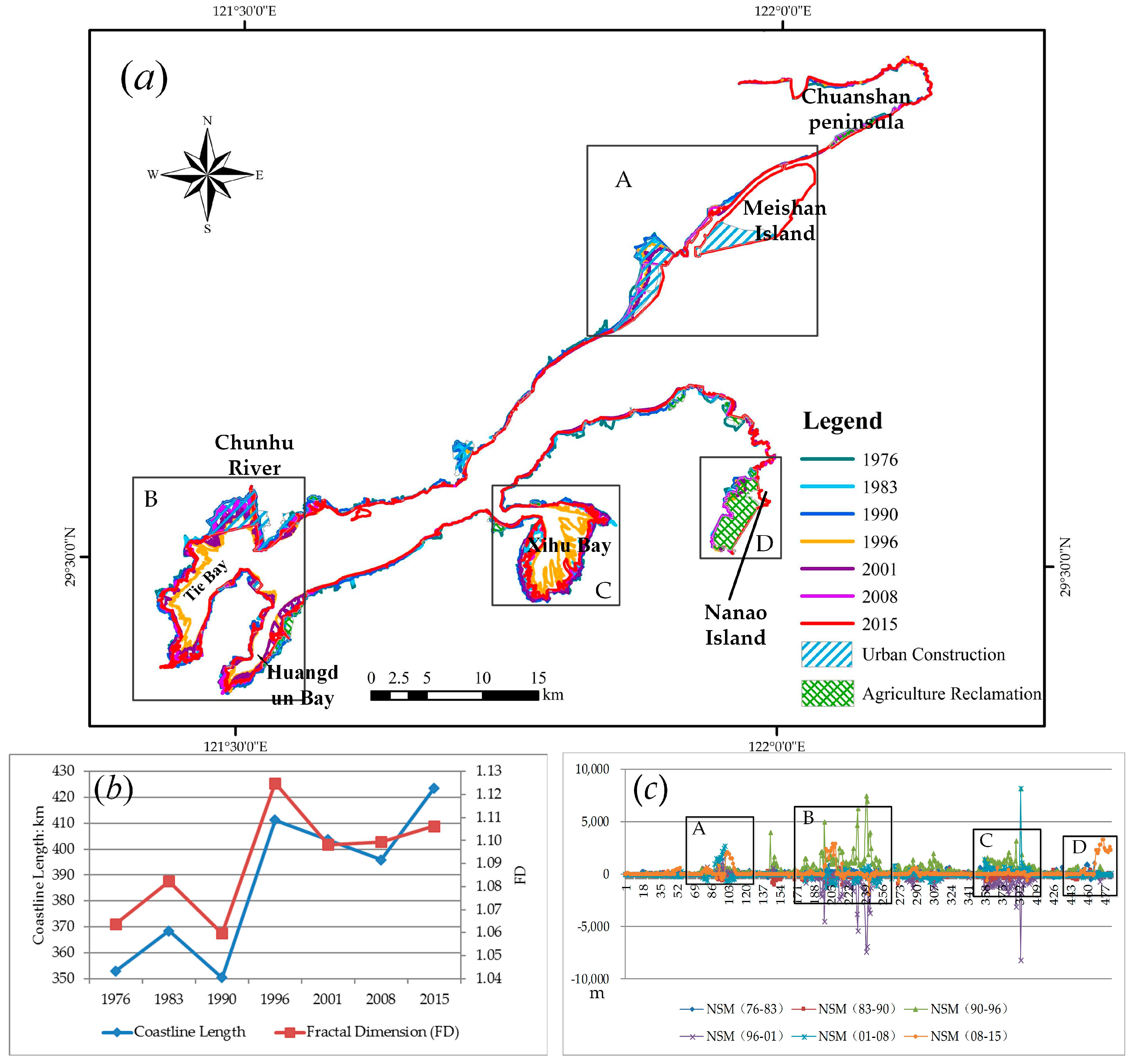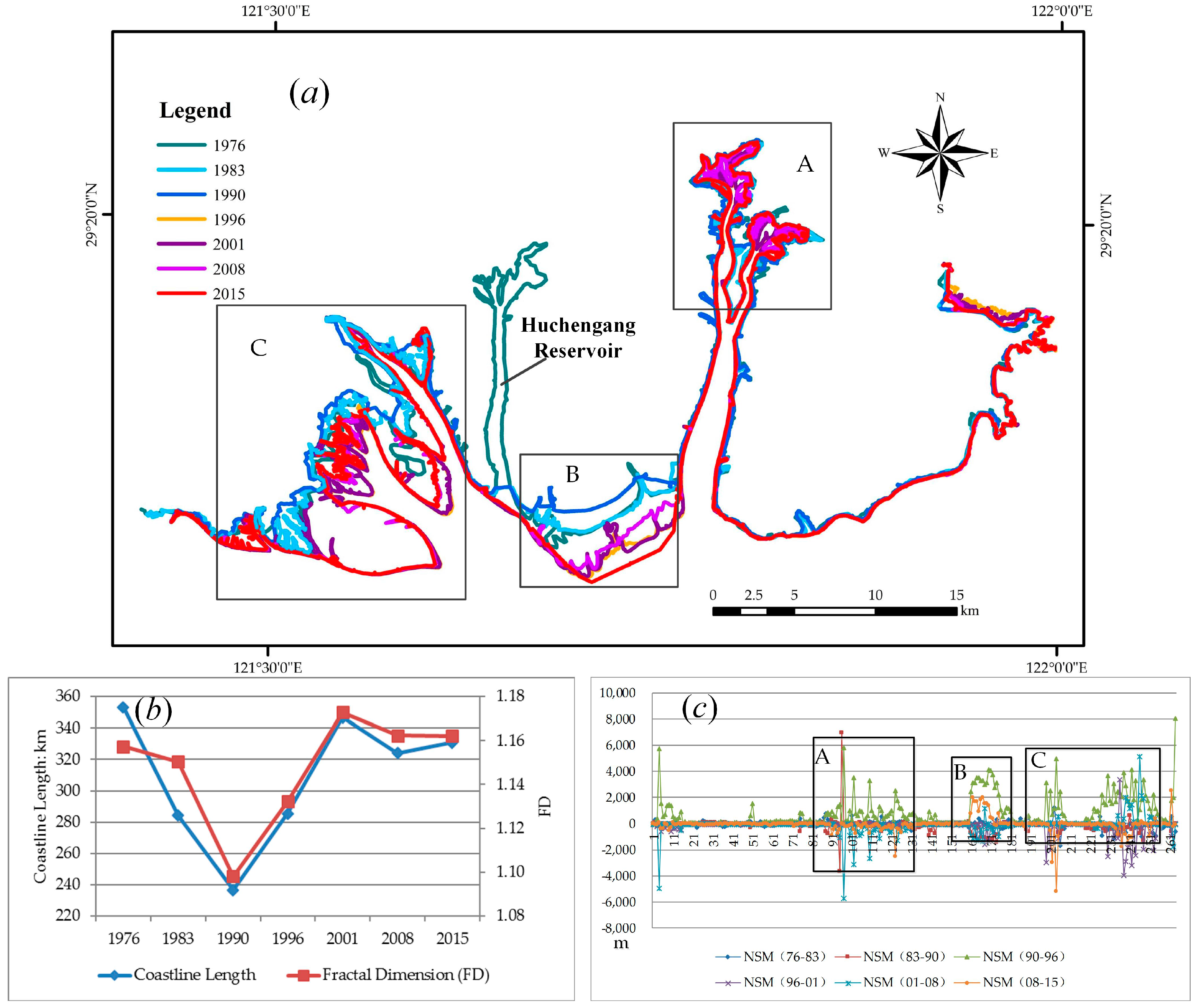 Figure 9a illustrate the remarkable migration along the coastline of Sanmen Bay. The average annual NSM of all the coastlines were 10 m/year. Considering the length and the FD value, the general change pattern of the coastlines was divided into three stages: the rapid decrease stage (1976–1990), the quick increase stage (1990–2001), and the small decrease stage (2001–2015).