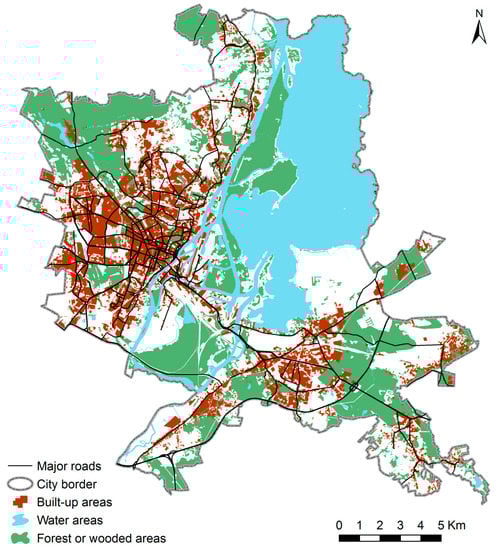The case study area is the Commune of the City of Szczecin, situated in the northwest of Poland, next to the Polish–German border, on the Odra River. In 2015, Szczecin had ca. 405,000 inhabitants. The total area of the city is ca. 300 km2, of which ca. 78 km2 are forest or wooded areas, ca. 70 km2 are water areas, and only ca. 45 km2 are built-up and inhabited areas (Figure 1).