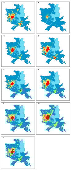 The spatial distribution of crime types in Szczecin from 2006 to 2010. (A) Fights and battery; (B) Drug crimes; (C) Robbery; (D) Residential crimes; (E) Commercial crimes; (F) Car crimes; (G) Theft of property—other; (H) Burglary in other commercial buildings; (I) Property damage.