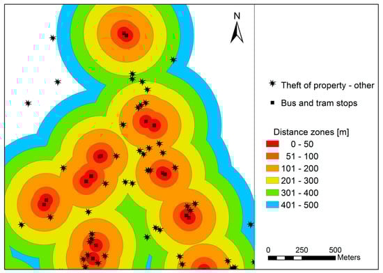 Spatial distribution of the crime type “theft of property—other” together with multiple buffer areas around the land use type “bus and tram stops”.