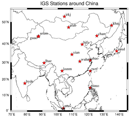 The distribution of IGS stations within and around China used to establish the sophisticated model.