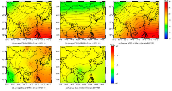 (a) distribution of average VTEC value of DM in the China region for DOY 101, 2011; (b) distribution of average VTEC value of BKM in the China region for DOY 101, 2011; (c) distribution of average VTEC value of SKM in the China region for DOY 101, 2011; (d) distribution of average bias between BKM and DM in the China region for DOY 101, 2011; and (e) distribution of average bias between SKM and DM in the China region. The color denotes the degree of the bias for DOY 101, 2011.