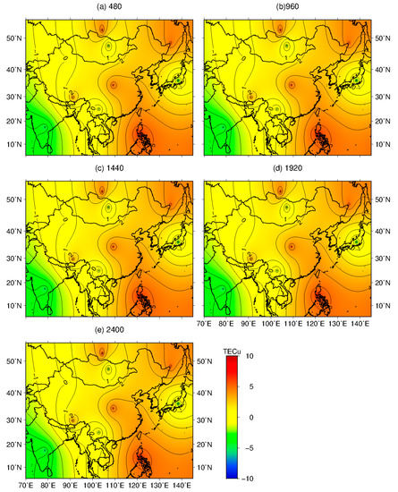 To determine the accuracy that SKM can achieve while considering epochs missing in the observation data, we consider the following cases: random deletion of 480 epochs (480), 960 epochs (960), 1440 epochs (1440), 1920 epochs (1920), and 2400 epochs (2400). The elimination of random epochs is carried out for each day. For example, random deletion of 480 epochs (480) means that these random 480 epochs are missing for all six previous days. Moreover, cubic spline interpolation is a special case of spline interpolation that is used very often to avoid the problem of Runge’s phenomenon. It gives an interpolating polynomial that is smoother and has a smaller error than some other interpolating polynomials. Therefore, a cubic spline curve [44] is used to restore the missing TEC values calculated by BKM. Next, the TEC values in China are determined using the method described in Section 2.3.