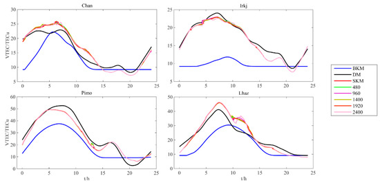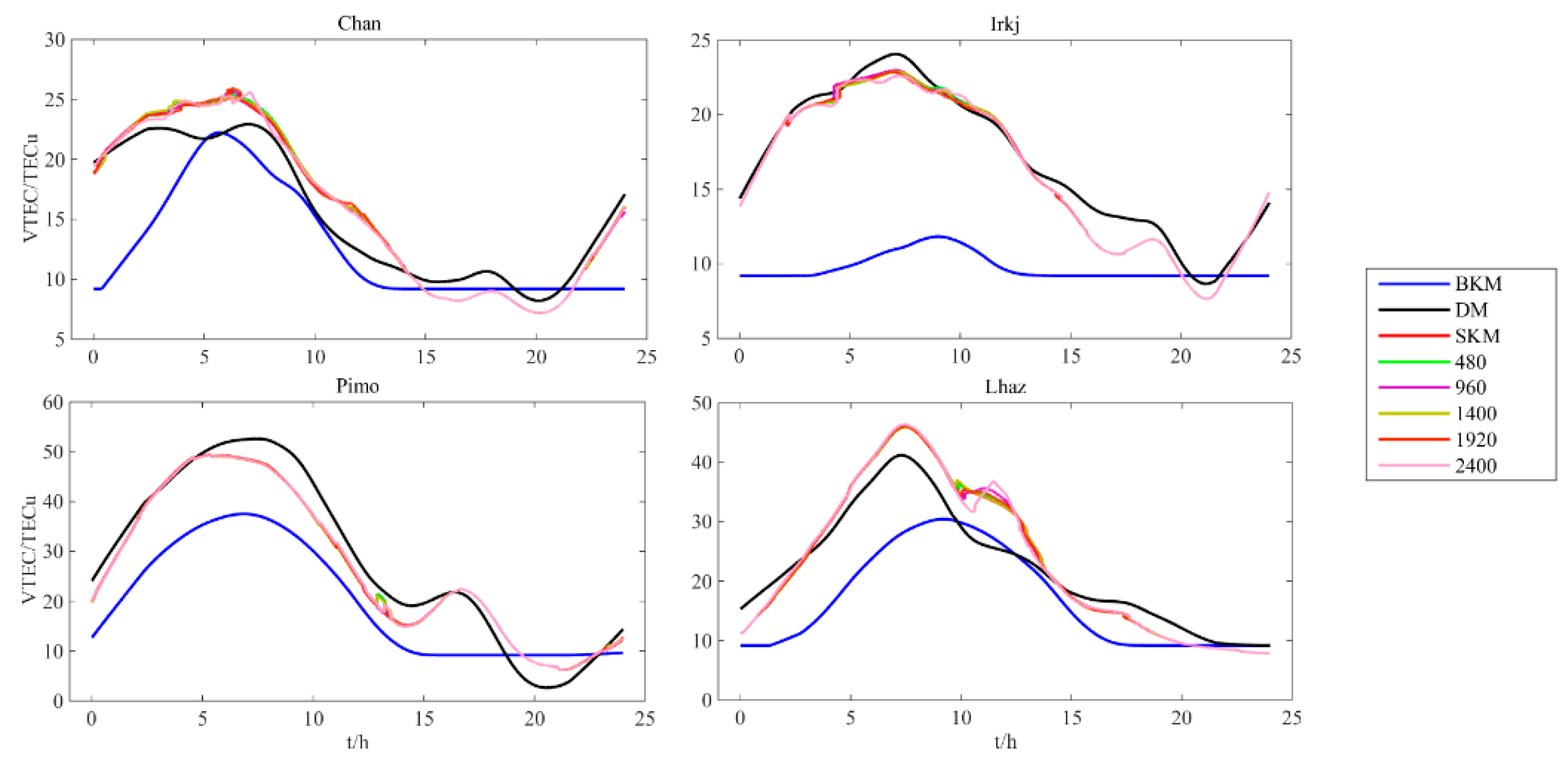 Daily variation of vertical TEC at some stations. Top left: CHAN station. Top right: IRKJ station. Bottom left: PIMO station. Bottom right: LHAZ station. Blue lines represent the VTEC values of BKM; black lines represent the VTEC values of SM; red lines represent the VTEC values of SKM with no epochs missing; green lines represent the VTEC values of SKM with 480 epochs missing; purple lines represent the VTEC values of SKM with 960 epochs missing; bottle green lines represent the VTEC values of SKM with 1400 epochs missing; brown lines represent the VTEC values of SKM with 1920 epochs missing; pink lines represent the VTEC values of SKM with 2400 epochs missing.