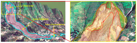 Remote sensing as a promising technology has a wide range of applications in landslide studies [3,4,5]. The landslide-related studies can be concluded in three stages: (a) detection and identification; (b) monitoring; and (c) spatial analysis and hazard prediction [4,6,7]. The use of remote sensing data (airborne, satellite, or ground-based) varies according to the three main stages above. For monitoring landslide movements, the quantitative volumetric analysis was often adopted by using a series of DEMs derived from the available topographical maps or airborne images [8]. As concluded by Kääb [9], analytical and digital photogrammetry techniques are highly suitable for monitoring geometric changes in high mountains and obtaining surface information, such as terrain displacement. Especially by using the airborne laser scanning technology, it is convenient for rapidly collecting high densities of precise and high-resolution 3D point coordinates, which can be used for 3D geometrical modeling and analyzing the surface topography of a landslide [10,11].