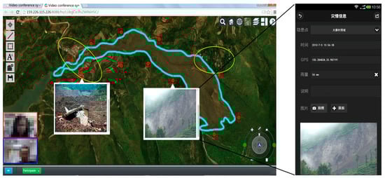The results of image interpretation and related data can be processed and shared through an online cooperating emergency platform. It provides a video conference system and additional editing tools based on web-GIS functions used for hazard analysis (see Figure 8). A further image interpretation and hazard assessment can be achieved through online discussion of the experts. It had basic tools for drawing and editing on the hazard map. In addition, a mobile application was developed for on-site data collection and verification. On-site photos and videos can be collected and sent back to the data center through the application. The developed online platform can be used to improve the coordination of all players involved (e.g., hazard experts, emergency managers, and first response organizations) in all phases of emergency management.