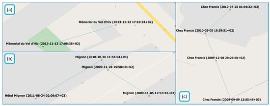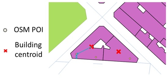 It would be logical if the POIs inside the same buildings were consistent with each other, i.e., located similarly at the center of the amenity, or at the entrance (Figure 6), because either the contributor is the same or the first contributors direct the following contributors. Thus, we checked this assumption for more than 4000 buildings in Paris that contain more than two POIs.