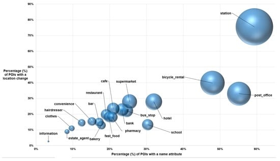 Percentage of POIs that had a name (x-axis) and a location (y-axis) change. The size of the bubble corresponds to the intersection of the two changes.