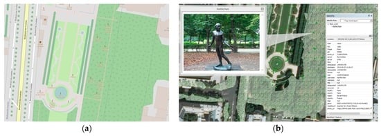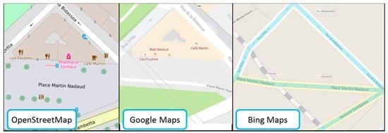 From the beginning, assessing data quality was one of the main research topics related to VGI, and particularly OSM (see for example [1]), and is mainly performed through comparisons with authoritative reference datasets [2,3]. Many methods have then been proposed to assess VGI quality; a review can be found in [4,5,6], among others. The quality assessment of VGI POIs is essential as many applications are based on such data, and can be affected by low-quality POIs. POIs from OSM, Wikipedia, or social networks such as Facebook or Swarm can be used for user-centric wayfinding [7], for population analysis [8,9], for land use mapping [10], for urban analysis [11], or for the analysis of people’s perception of places [12].