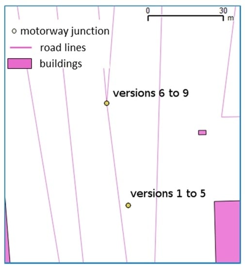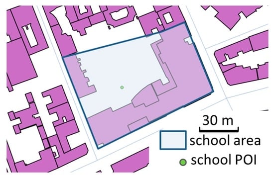 Another way to carry out intrinsic quality assessments of VGI is to rely on the geographic properties of features [28]. If we find expected spatial relationships within the VGI features, e.g., a motorway junction is at the intersection of a motorway and another road, the quality tends to be good. On the contrary, if we find impossible or improbable spatial relations within the features, e.g., a shop POI is outside a building, then the quality tends to be poor. This use of spatial relations to guide the quality assessment has already been implemented in [29]. However, the main problem is that POIs are points that represent a geographic entity that has a geographic extent often much larger than the point, so, for example, where do we put a point that represents a school: in the school boundaries, at the entrance of the school, or in the middle of the school? There is no unique solution to this problem (Figure 3), and we propose different methods for different types of POIs in the next sub-sections. This will improve overall quality as it will improve the consistency of the contributions.