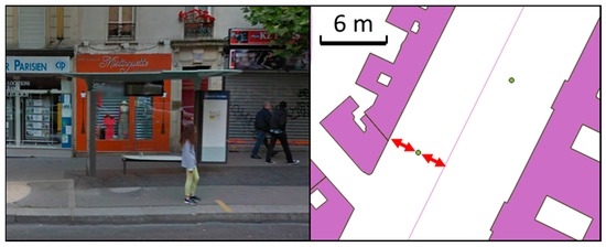 In Paris, bus stops can be marked either by a bus shelter, as in Figure 8, or by a sign, but they are always located on the pavement, so there is a minimum distance between the bus stop and the closest building boundary and between the bus stop and the road centerline. There is not enough information in the OSM data to check if the bus stop is on the pavement, but we can check that it is not too close to the nearest building boundary or the road centerline. We also want to measure whether there is a road close to the bus stop, because there is no bus stop without a road nearby.