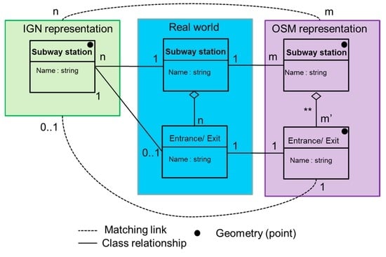 Figure 9 illustrates the data model for subway station representation and defines the links between the real world and the two representations from IGN and OSM. Thus, a subway station in the real world (represented in the blue box) is characterized by a name and a certain number of subway entrances and exits. Regarding the representation of subway stations in the two datasets, two main differences can be noticed. In the IGN dataset (green box), a subway station from the real world is represented by n features. Thus, with respect to the IGN data specification, two types of mapping for each subway station are possible: (i) for subway stations without a connection between several lines, only one point feature is represented in the dataset; (ii) for subway stations that connect to at least two subway lines, at least two feature points are represented in the dataset. Even if the concept of entrance/exit does not exist in the IGN dataset, the features representing the subway station are frequently located close to an entrance.