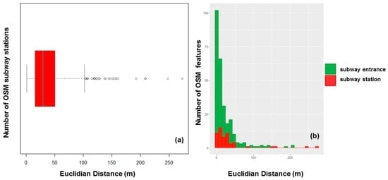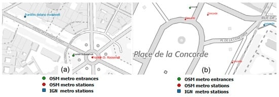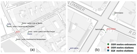 Figure 10 shows an example of two different representations in the IGN and OSM datasets. For example, Duroc subway station (Figure 10a) has one point in OSM data and two points in the IGN dataset that are closer to two subway entrances in OSM (‘Duroc—sortie 3 place Léon-Paul Fargue and ‘Duroc—sortie 1 boulevard des Invalides’). On the contrary, for Saint-Sulpice subway station, one point is mapped in both IGN and OSM data but there is no link between the IGN subway station and the OSM subway entrance. In Figure 10b two OSM entrances can be seen near the OSM subway station; one of them can be considered a duplicate entrance and should be removed.