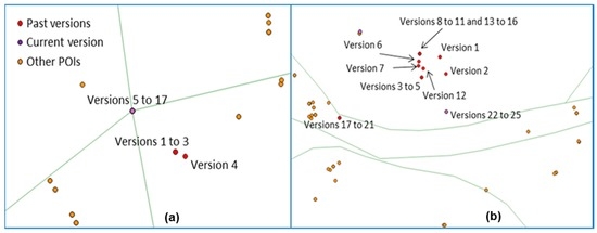 Regarding bus stops, the methodology described in Section 4.5 was used on each version of the bus stops. In this case, the combination of the historical and spatial relation methods does not highlight any specific pattern. There are many cases where the edits to the geometry move a point off of a building boundary or a road centerline (version 3 to version 5 in Figure 18), but there are also many cases where the bus stops are put too close to a road or building, and other cases where these two spatial relations are insufficient to determine whether the edits have improved or degraded the quality. For instance, the bus stops in Paris have been displaced considerably in recent years, and different POI versions often result from this displacement (e.g., version 1 to version 3 in Figure 18).