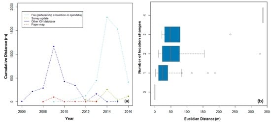 As mentioned in Section 2.2, a change in IGN data is possible when the following situations occur: a change in the real world, error corrections, a change in data specifications, or new partnership agreements for sharing open data arise for some layers. Whatever the source of information, all features used to update IGN POI datasets are checked and follow the data quality validation. Figure 19a illustrates the changes in subway stations in the Paris region from 2006 to the present with respect to the source of information. We can see that, from 2006 to 2011, position changes are mostly due to updates and they are coming from another IGN database (blue line). Some thematic changes (the cumulative distance is 0) coming from paper maps (red line) can also be observed from 2010 and 2013. The interesting point to highlight is that starting with 2012 (line light blue), the change in the subway station location is high, the cumulative distance being more than 1600 m in 2014, followed by 1500 m in 2015, and tending towards stability (e.g., less than 500 m). This is due to a new partnership agreement between IGN and the RATP. Indeed, we have noticed that 93% of the subway stations that changed in 2014 are from the RATP database. Figure 19b illustrates the variation of distance between consecutive changes with respect to the number of changes, which shows that the number of changes correlates positively with the median distance between consecutive changes. For example, for subway stations having two location changes over time, the median distance is around 50 m and more than 300 m for subway stations having four location changes.