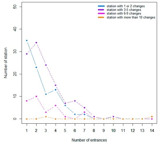 In order to examine if there is any correlation between the importance of the subway stations and the number of changes, we tested the hypothesis that the more important the subway station is, the higher the number of changes in the location should be. To measure the importance of the subway station, we counted the number of subway entrances. The results illustrated in Figure 20 are quite surprising, showing that the number of changes is not linked to the importance of the subway station. For example, the blue line represents subway stations with 1–2 changes. We notice that 35 subway stations with only two changes have just one subway entrance in OSM.