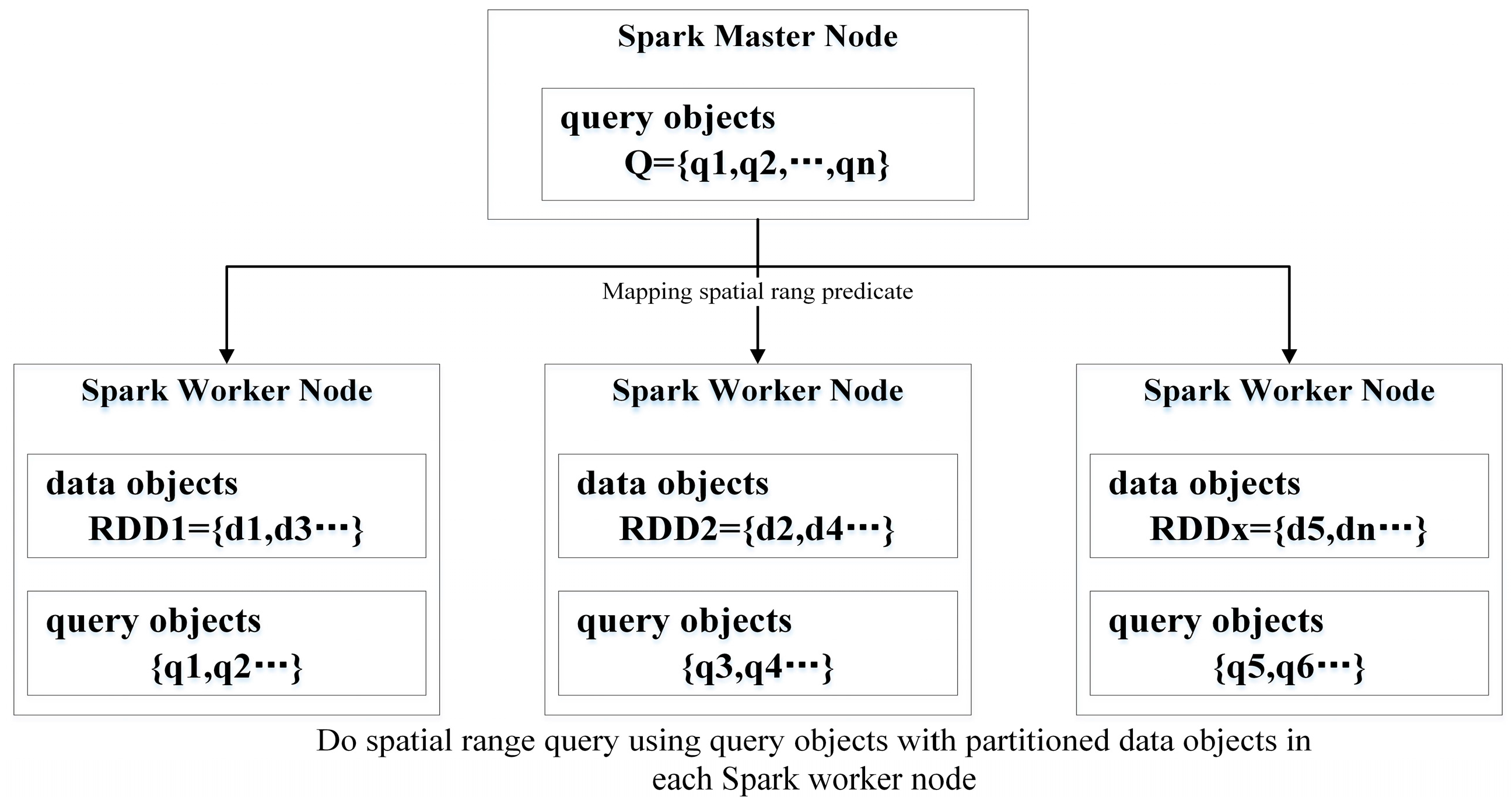 Figure 1 shows the execution of a Spark-based SRQ algorithm (SSRQA). First, spatial data objects are partitioned and stored in distributed nodes. Then, the query objects are broadcast to the nodes where the partitions reside. In these nodes, each query object is used to match the data objects by performing a spatial range predicate computation. We employ GeoSpark for processing large scale spatial data in this work, which is a software package that provides basic geometrical operations. BitTorrent-enabled broadcasting is the main approach for the Spark master to share the immutable objects with Spark workers [10]. Sharing data, the volume of which does not exceed the Java Virtual Machine (JVM) heap size of the Spark master instances, is efficient. Implementation of a simple SSRQA includes only one mapping transformation.