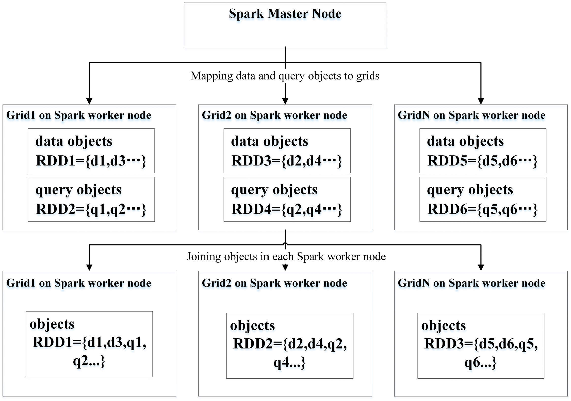 A Spark-based NNQ algorithm (SNNQA) executes as follows. If we suppose that the query objects are small and that the data objects are huge, the query objects can be broadcast to the computing nodes where the partitioned data objects reside. In these nodes, Spark workers execute spatial predicate computations using local spatial data objects. It is assumed that the query objects are too large to be shared, whereas the data objects are relative small. We can then spatially partition the data objects into grids and, if necessary, build an index for them [24]. The grids can then be broadcasted to the computing nodes where the query objects reside. If both the data objects and the query objects are too large to be shared, it is still possible to divide the query objects into chunks and submit the same algorithms with the different chunks as their input. Implementation of a simple SNNQA includes only one mapping transformation. Since the execution flow of a SNNQA is fairly similar to that of a SSRQA, we omit the schematic diagram here in order to save space.