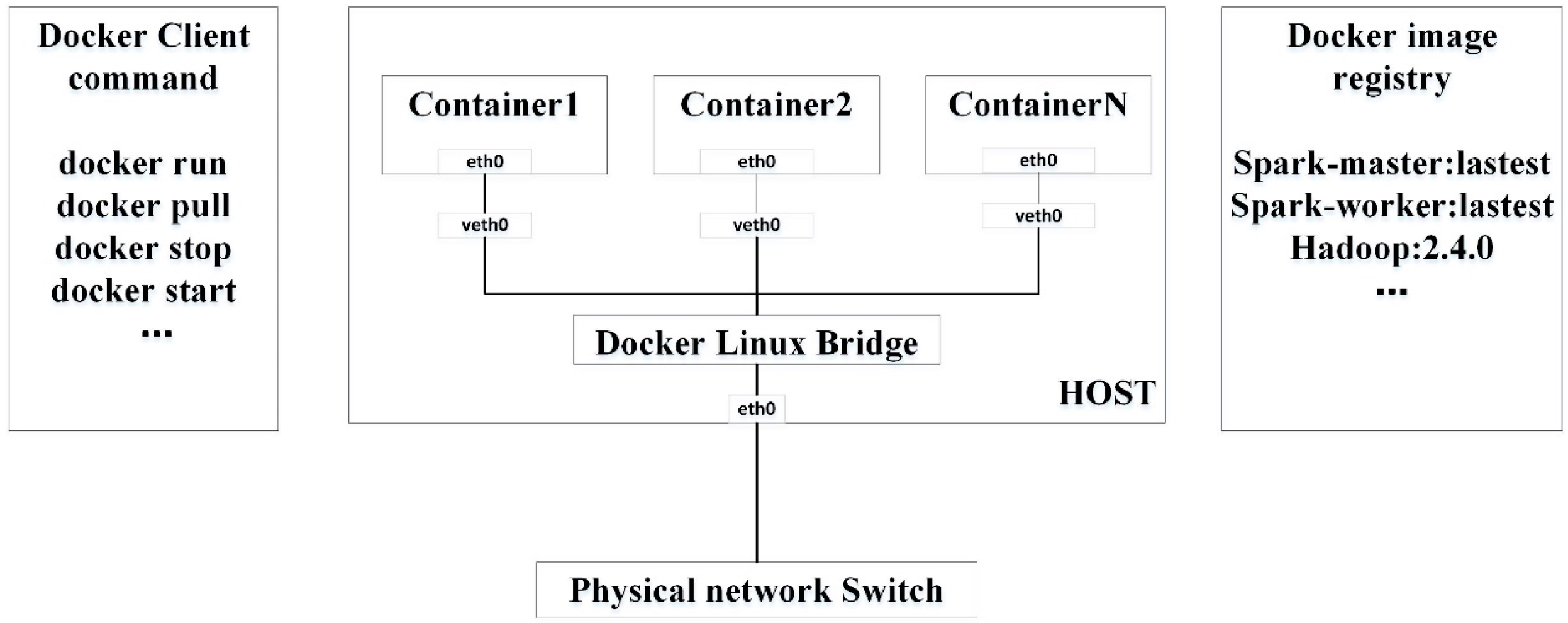 Our testing system is based on Docker, which is an open source project for automating the deployment of containerized applications in a Linux environment [29]. Docker is a framework that manages the lifecycle of application containers. An application and its dependencies are encompassed into an image. A Docker image can be built from a basic image and other existing images. The basic image is a minimum operating system such as a community enterprise operating system (CentOS), Rancheros, or CoreOS. Applications and a basic image are combined into a single layer-wised image. Layer-by-layer storage facilitates sharing and updating the application components at minimum cost. From Docker’s point of view, a container is the basic management unit in which an application runs. Docker containers share the basic operating system with other containers rather than use another copy. Figure 3 shows how Docker clients would instruct a Docker host to launch containers for running applications with specified images. The Docker image registry is the dedicated gallery for storing the images. We use a private image registry to store Spark-master and Spark-worker images in our tests.